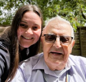 Young woman with long brown hair taking a selfie photo with an older man with grey hair, wearing glasses; they are outside